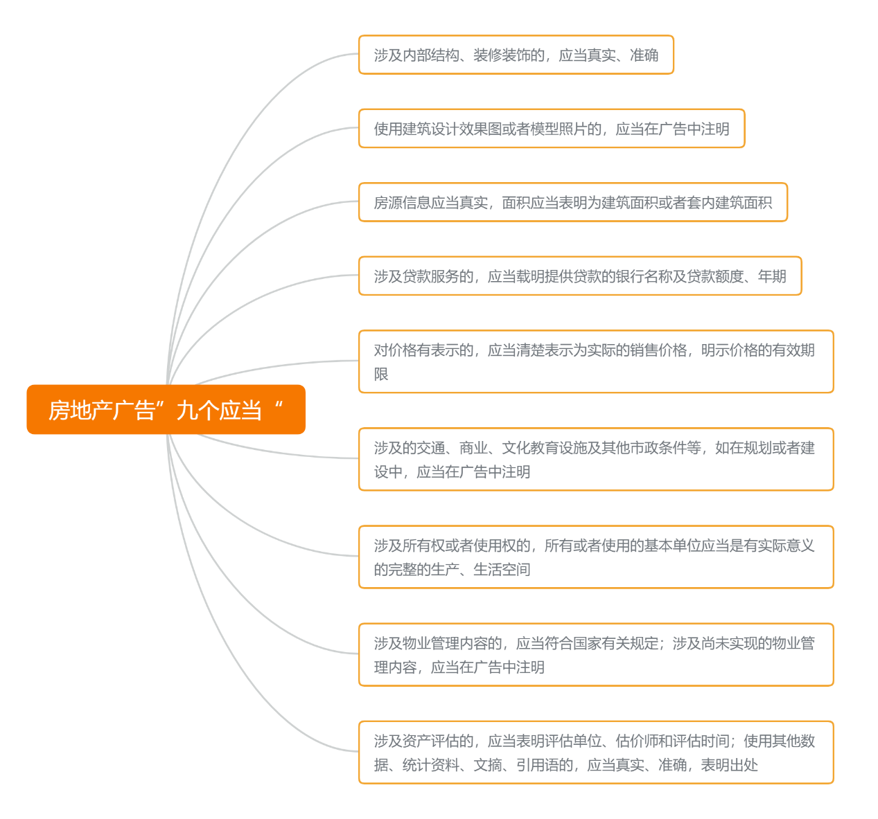 除《廣告法》中規(guī)定的廣告不得有的情形及禁用的詞語(最高級用語)外,房地產(chǎn)廣告還應注意如下“九個應當”: